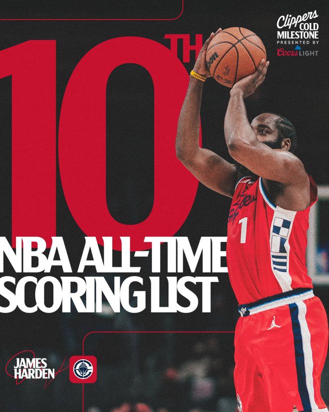 历史第11人!哈登生涯总得分突破28000分大关